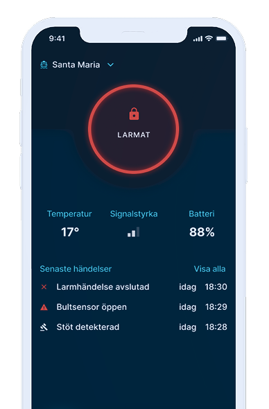 Håll koll på båten Förbli ansluten till din båt. Övervaka temperatur, signalstyrka, batteri och händelser. Du kan skapa din egen larmkedja, då ett larm utlöses så skickas sms och notifiering direkt till dig och dina förvalda kontakter. Larmet kan även skickas till nattvakt eller larmcentral. Hantera och agera på larm i appen Få larm via sms och pushnotiser i telefonen Skapa en egen larmkedja Båtkortet – dokumentera dina ägodelar